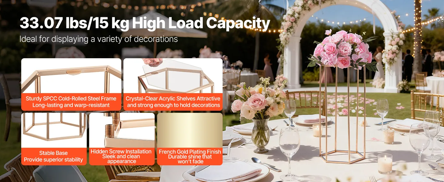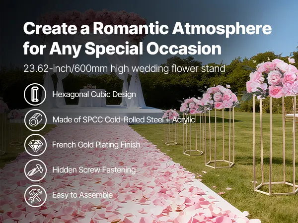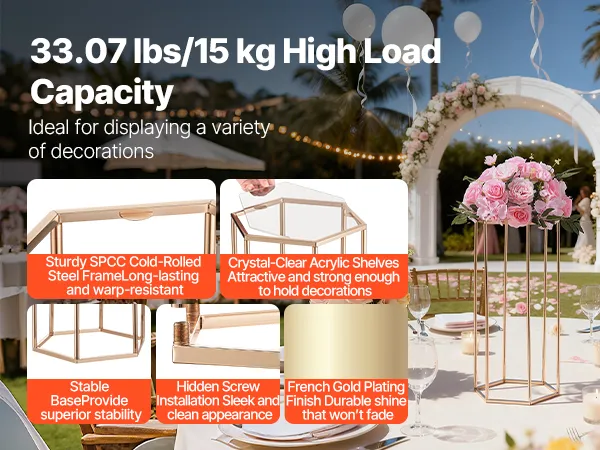 Il nostro portafiori per matrimoni presenta un design a cubo esagonale che bilancia stabilità ed stile, con una portata di 15 kg. L'acciaio SPCC spesso e gli strati in acrilico trasparente offrono resistenza ed eleganza, impreziositi dalla placcatura in oro francese.
