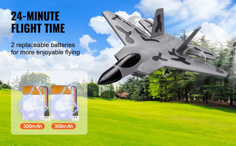 Viene fornito con due batterie da 300 mAh. Ogni batteria offre circa 12 minuti di tempo di volo. Insieme, forniscono fino a 24 minuti di divertimento ininterrotto. Questa caratteristica assicura che non dovrai mai aspettare a lungo per le ricariche, consentendoti di trascorrere più tempo volando e meno tempo in attesa. Questo tempo di volo esteso lo rende perfetto per sessioni di gioco più lunghe. È fantastico sia per i bambini che per gli adulti che amano far volare gli aerei RC!
