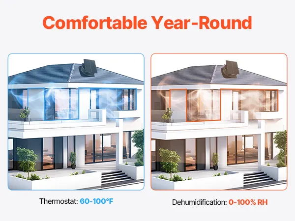Controllo intelligente della temperatura e dell'umidità: il controller integrato regola automaticamente la ventola di scarico del tetto in base alla temperatura e all'umidità. Goditi il comfort tutto l'anno, con rilevamento del fumo aggiuntivo che spegne la ventola per sicurezza