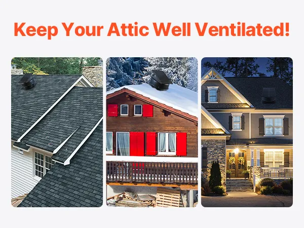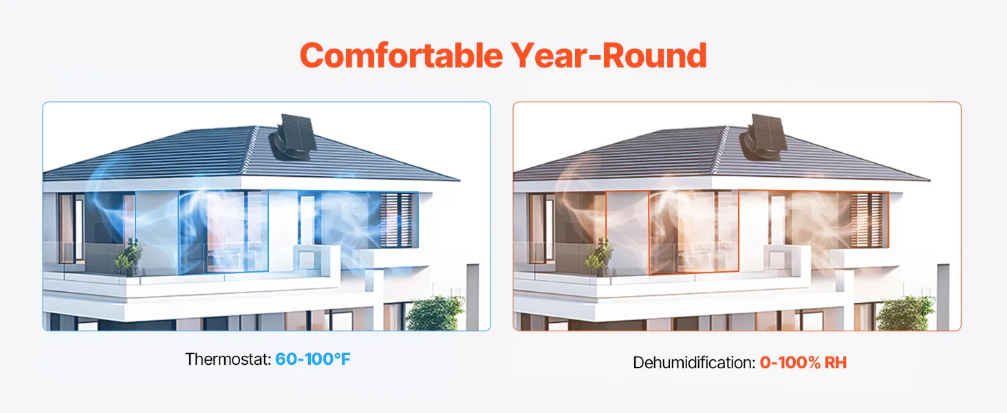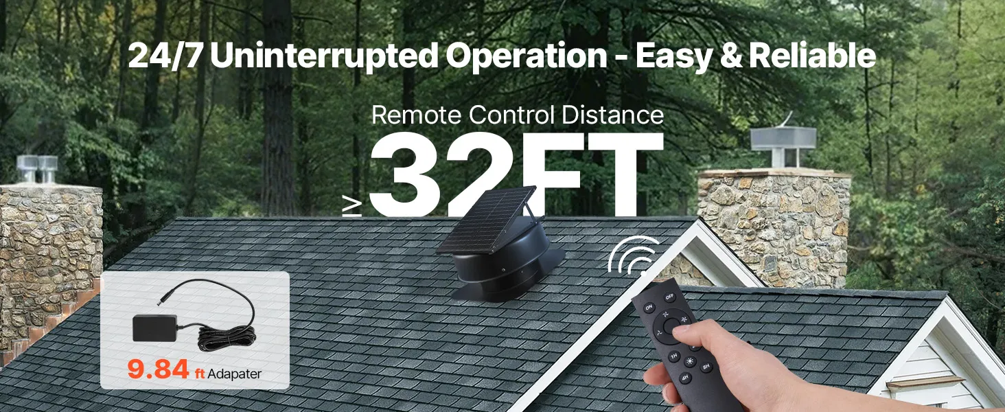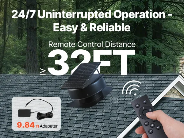 Funzionamento in tutte le condizioni atmosferiche e controllo remoto: la ventola di sfiato del tetto passa dall'energia solare a quella elettrica al tramonto, mantenendo la soffitta fresca 24 ore su 24, 7 giorni su 7, anche nelle giornate nuvolose. Viene fornita con un telecomando portatile per spegnere la ventola fino a 32 piedi (circa 9,75 metri) di distanza
