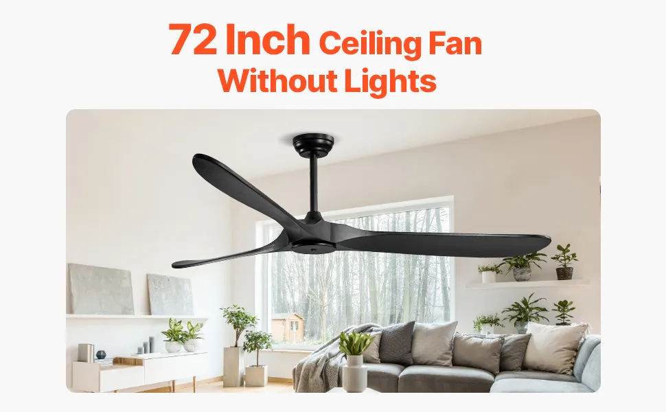 VEVOR Ventilatore da Soffitto Senza Luce da 180 cm Moderno Ventilatore Esterno a Filo a Basso Profilo, Telecomando a 6 Velocità, 3 Pale in Legno, Motore CC Reversibile, per Soggiorno e Patio, Nero