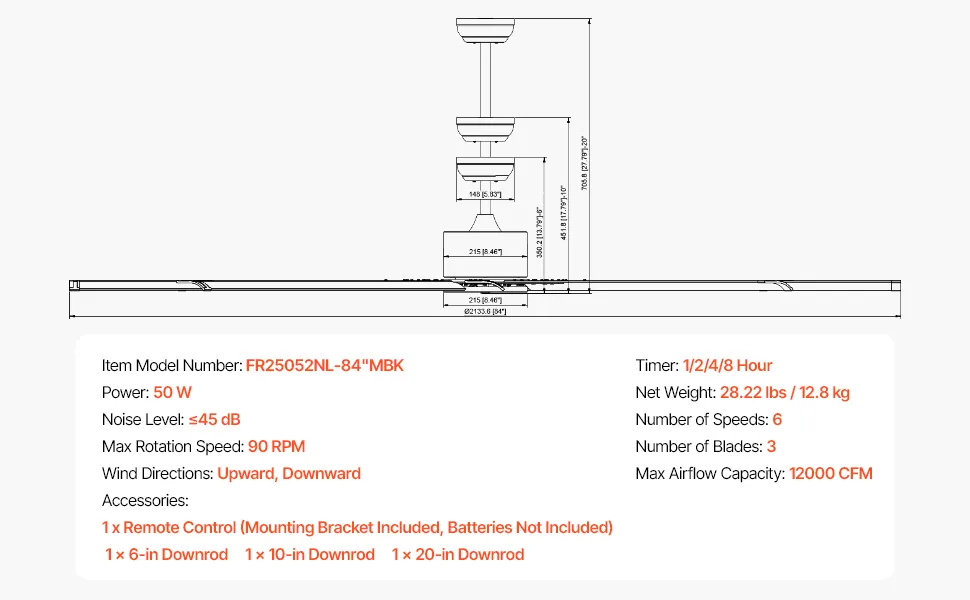 VEVOR Ventilatore da Soffitto da 213 cm Senza Luce, Telecomando a 6 Velocità, 8 Pale in Alluminio, Motore DC Reversibile, Moderno Ventilatore a Filo Basso per Soggiorno, Patio Nero