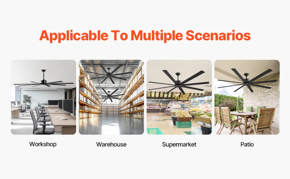 Dotato di un motore CC reversibile di alta qualità, questo moderno ventilatore da soffitto eroga un potente flusso d'aria (12000 CFM) mantenendo un basso livello di rumorosità (45 dB), garantendo un ambiente tranquillo e confortevole.