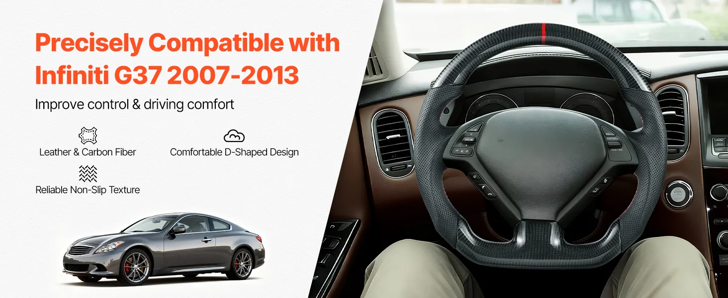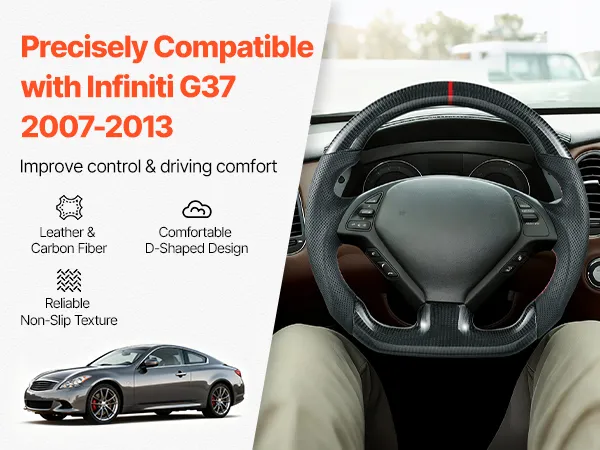 Progettato per Infiniti G37 2007-2013, questo volante si adatta al tuo veicolo e migliora la maneggevolezza e il comfort di guida. Realizzato in pelle e fibra di carbonio, il design a D con texture antiscivolo garantisce una guida sicura e confortevole.