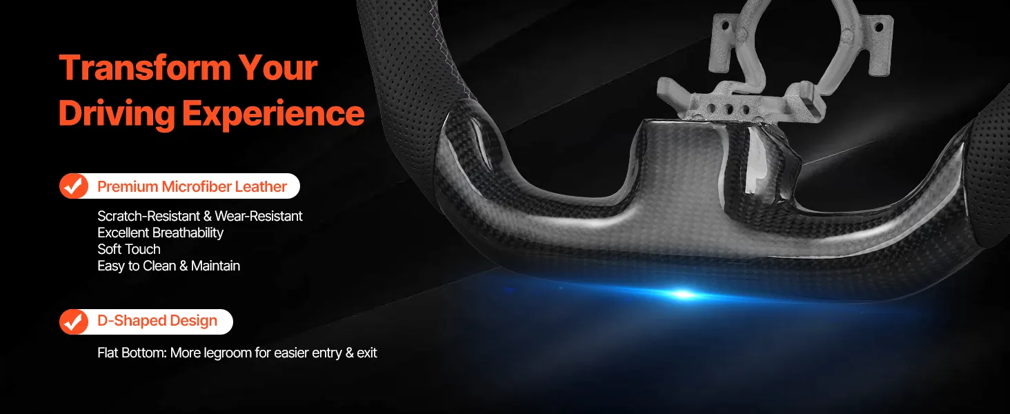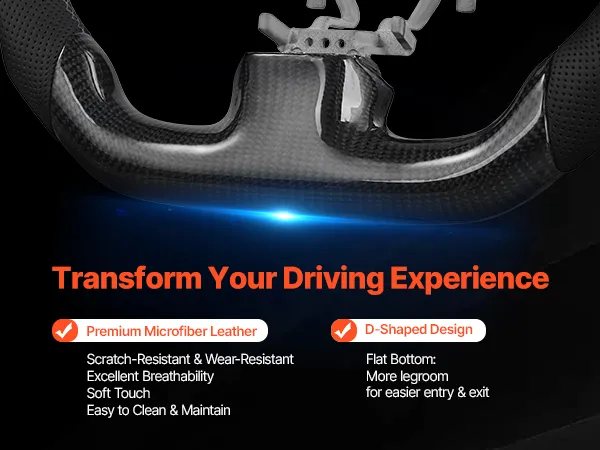 Trasforma la tua esperienza di guida. Questo volante in vera fibra di carbonio è realizzato in microfibra traspirante, morbida al tatto, resistente all'usura e ai graffi, e facile da pulire e manutenere. Il suo design a D aumenta lo spazio per le gambe.