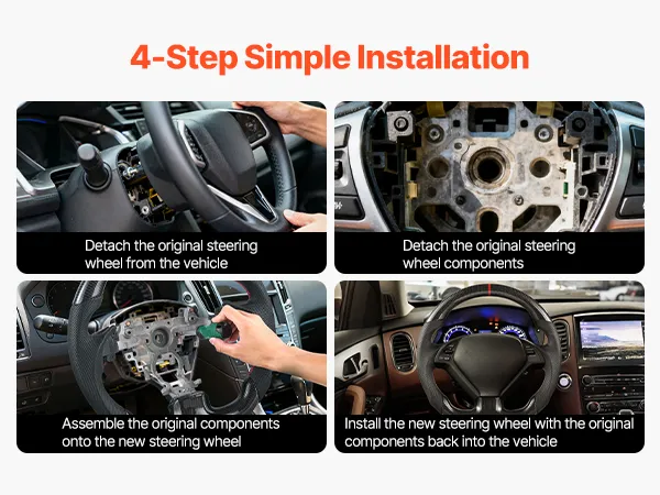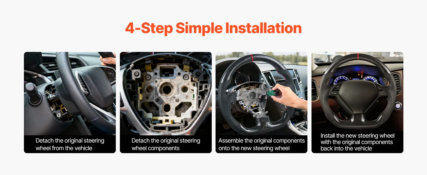 Installa questo volante a fondo piatto in quattro semplici passaggi: 1) stacca il volante di serie; 2) stacca i componenti OEM; 3) assembla i componenti OEM sul nuovo volante; 4) monta il nuovo volante. Non sono richieste competenze particolari: l'aggiornamento richiede pochi minuti.
