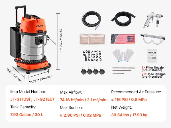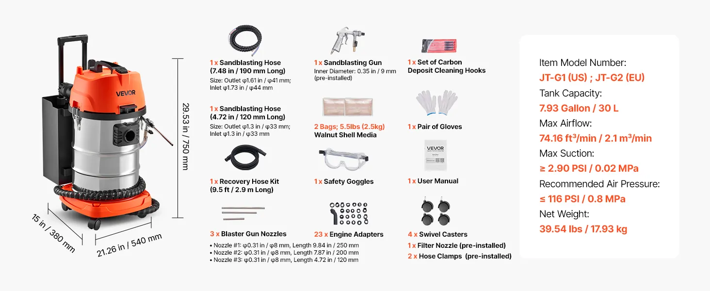 VEVOR Macchina per Pulizia della Sabbia di Noce da 30 Litri e 1600 W, Macchina per Sabbiatura Fisica su Carrello per la Pulizia del Collettore di Aspirazione, Sabbiatrici di Noce con 23 Adattatori