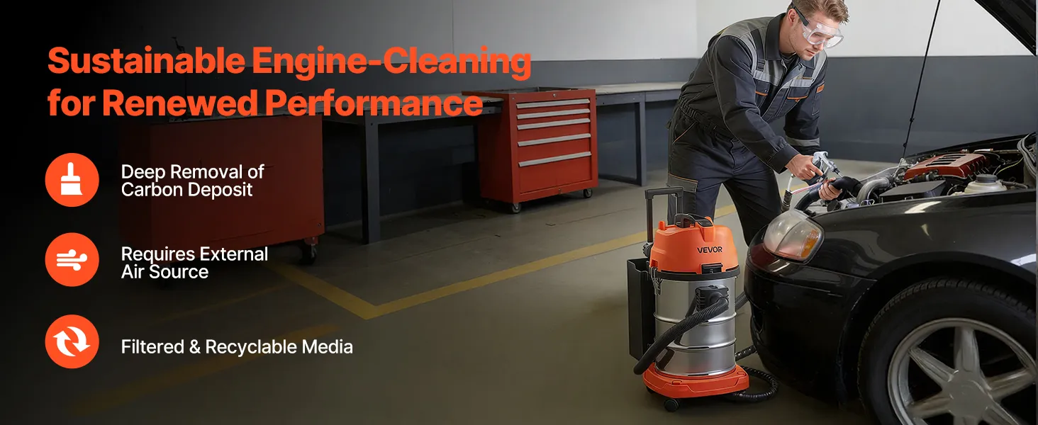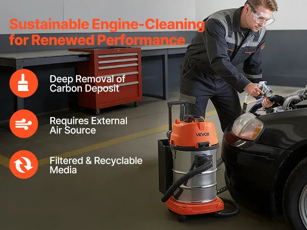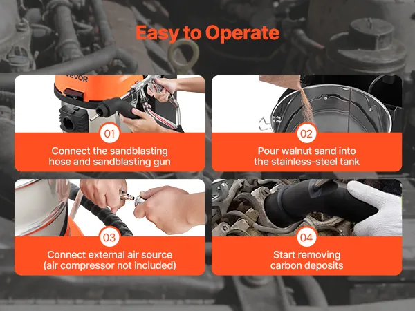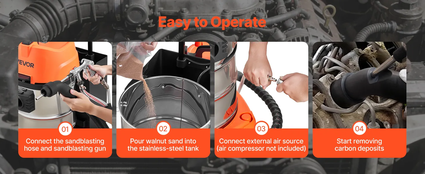 Si collega a un compressore d'aria (non incluso) per un funzionamento potente, consentendo alla sabbia di noce di rimuovere i depositi di carbonio con maggiore forza e ottenere una pulizia altamente efficiente.